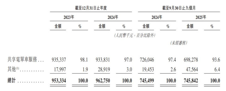 经营数据方面,截至2025年9月30日,松果在全国422个县市投放了454,627辆共享电单车,注册用户数已达1.28亿,规模相当可观。反映到收入上,松果的电单车业务在2024年实现收入9.34亿元,同比微降0.16%,同期收入占比约97%。